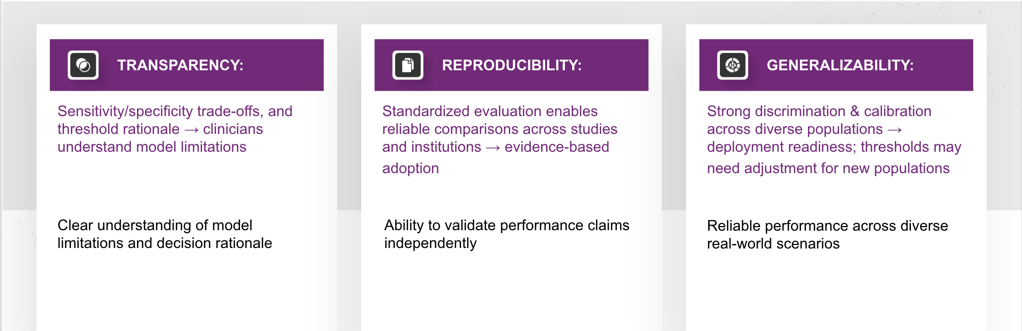 - Reproducibility: Standardized evaluation protocols allow us to reliably compare results across different studies and institutions, eliminating the “black box” problem.